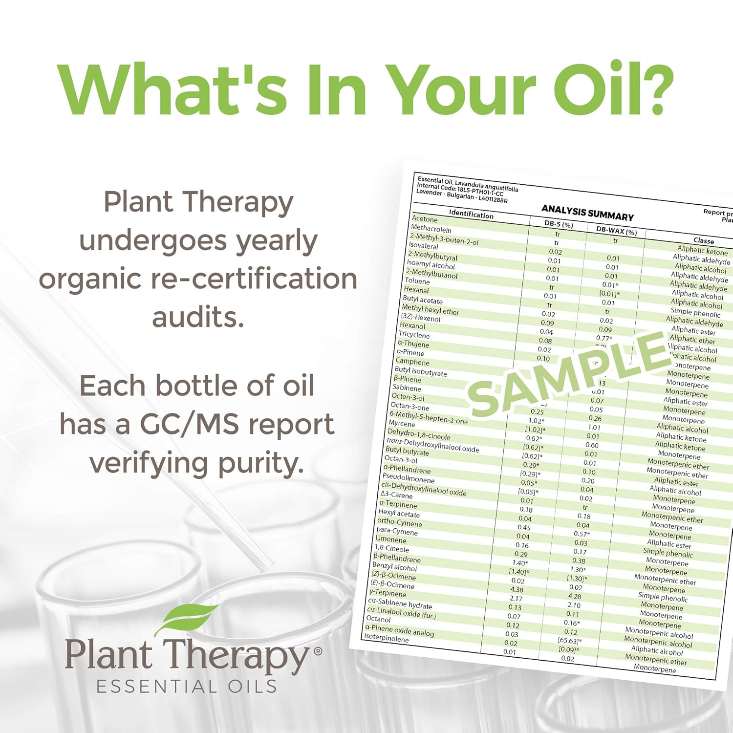 - BATCH SPECIFIC GC-MS REPORTS ON EVERY OIL: Every bottle of oil from Plant Therapy goes through multiple rounds of testing including organoleptic testing and multiple rounds of GC-MS testing by several third-party laboratories.