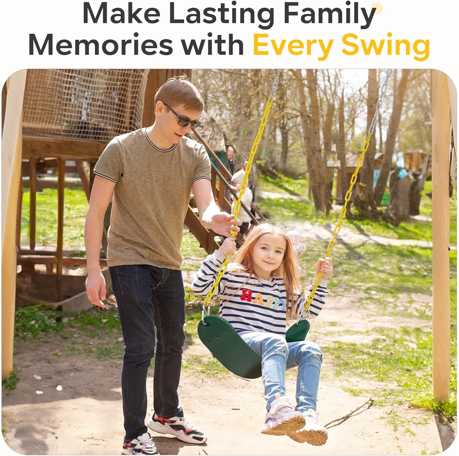- 【Anti-Rust Coated Chains 】Decorlife swing set include two 66 inch long zinc-plated heavy duty chains, 30 inch of which covered thermoplastic coating (industry-leading 0.5mm thickness) to prevent finger pinches no hair snags or tangles and resist rain/snow corrosion.