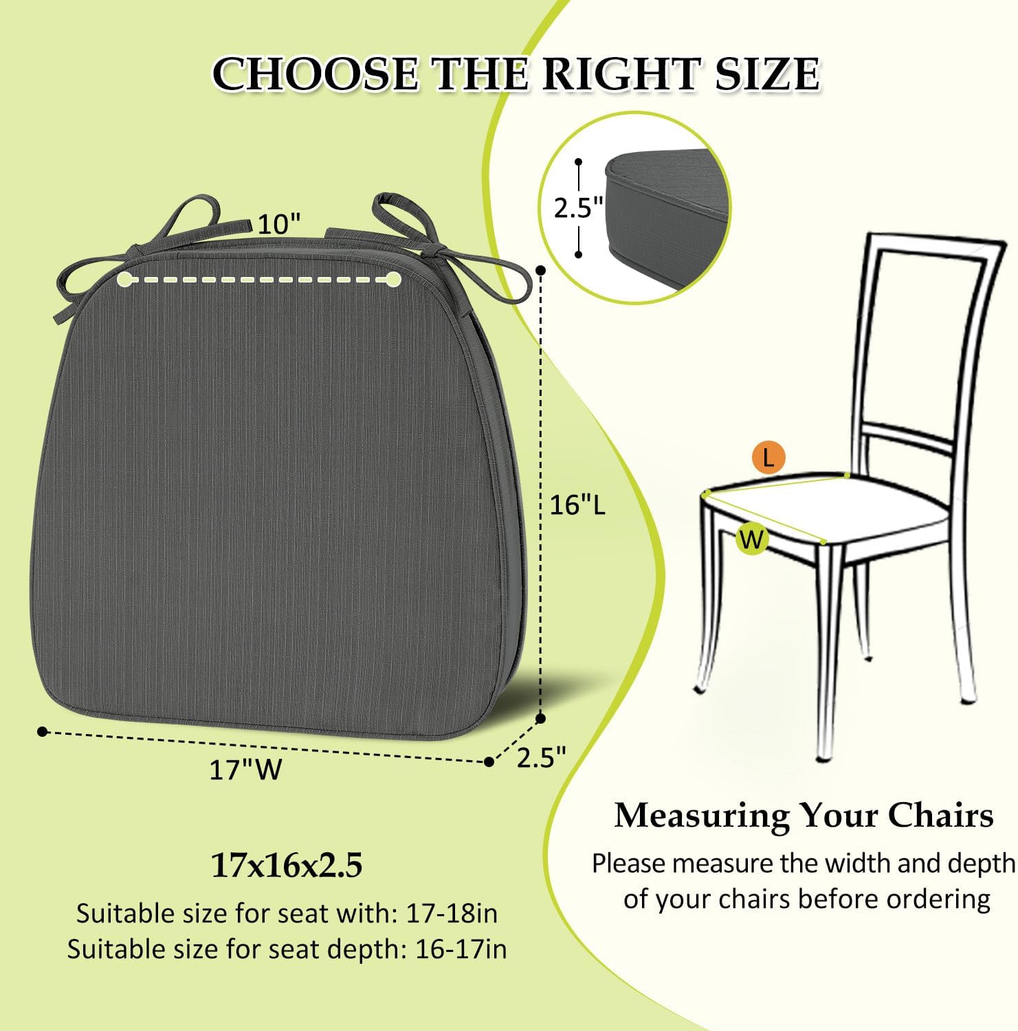 - Size Guide: These dining chair cushions measure 17" (L) x 16" (W) x 2.5" (H), designed to fit most standard dining chairs. They offer a practical solution to refresh your dining decor. Note: We recommend measuring the width and depth of your chair seat before purchasing to ensure a proper fit
