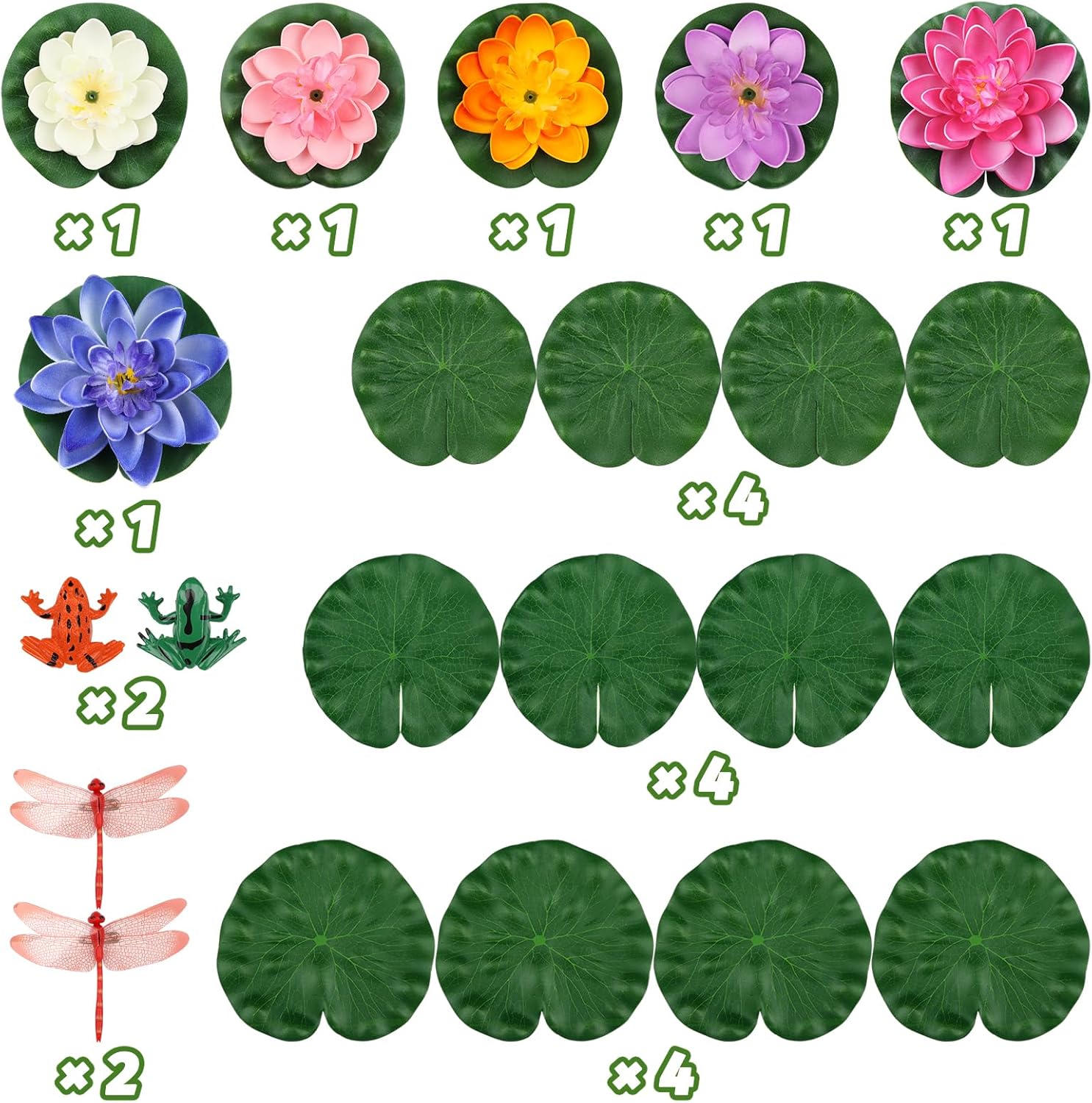 - Package Include: 1pcs 5.9inch Artificial lotus flowers, 1pcs 5.1inch Artificial lotus flowers, 4pcs 4.3inch Artificial lotus flowers ( orange, Pink,white and purple ),12 x floating foam lotus leaves (3 size, 4pcs / size), 2 pcs dragonfly and 2 pcs Artificial frog. They are small but beautiful, please confirm the size before buying.